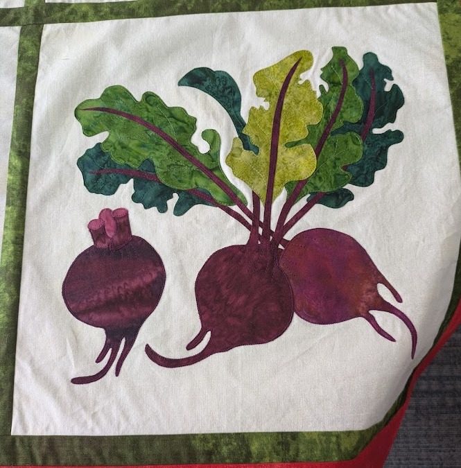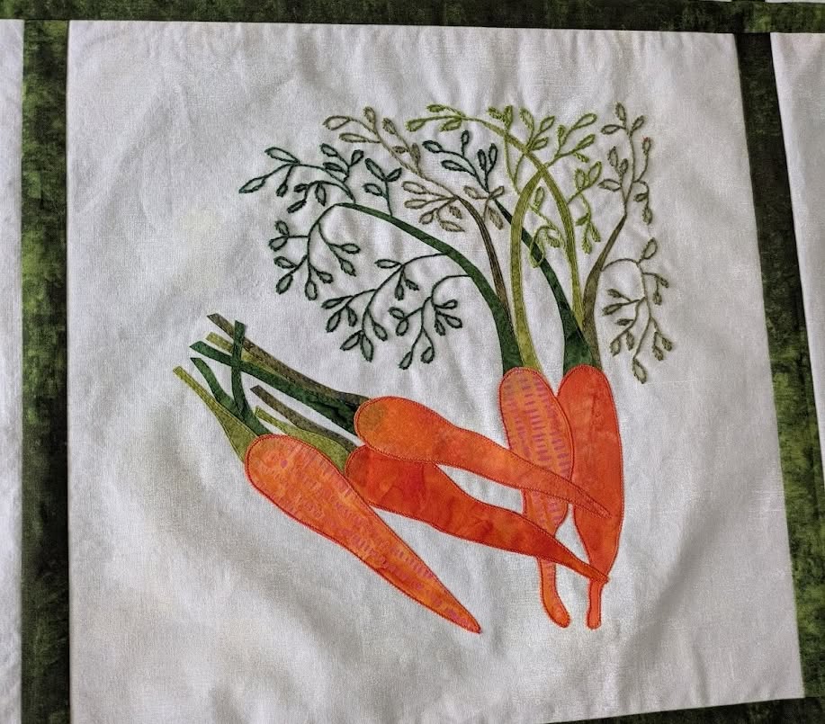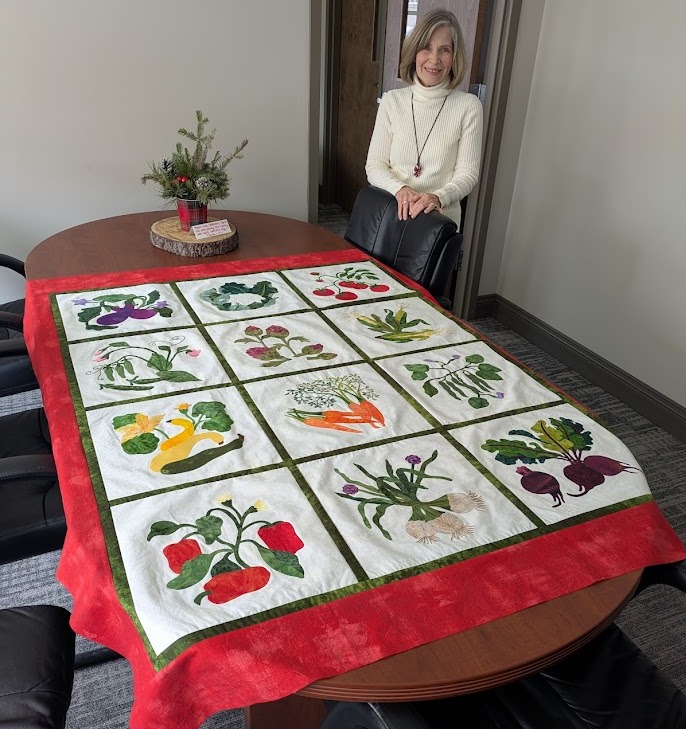 February 4, 2025 – Who says food is not beautiful? Barbara has been working on this gorgeous quilt for OCS for months. First we saw a block with corn and each individual niblet was hand stitched. Then the yellow squash with all its blossoms. You REALLY have to see the cauliflower with its felted surface!! And today she brought the whole thing before it is backed and quilted. I don’t have adequate words for the gratitude I feel, and the amazement–she planned, stitched, appliqued and will now complete this beautiful celebration of fresh garden vegetables that will ultimately hang in our conference room. Every time someone walks by and looks in–it will be hanging as a testament that every gift has its place and that we believe nutritious food is a right for our neighbors, not a privilege. Yes. Food IS beautiful. (Note: Barbara is also a Pantry volunteer!!)